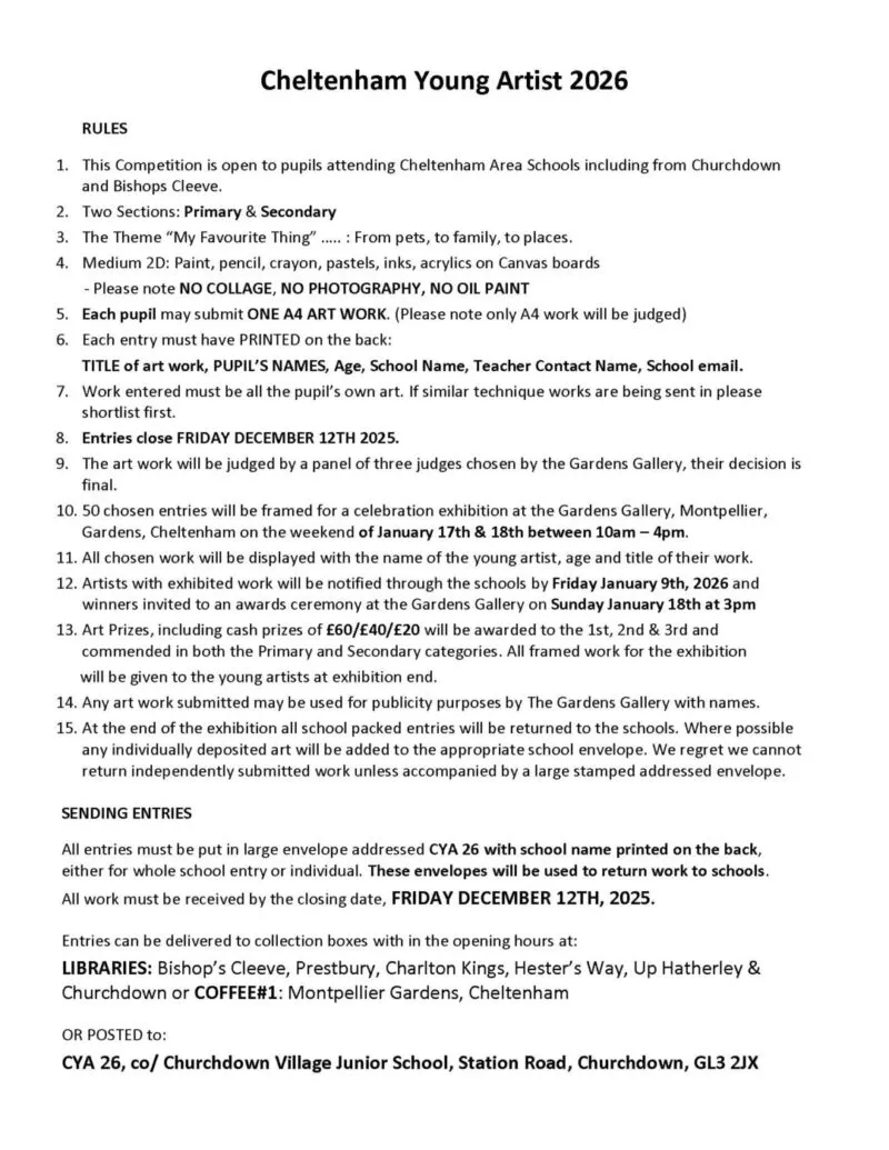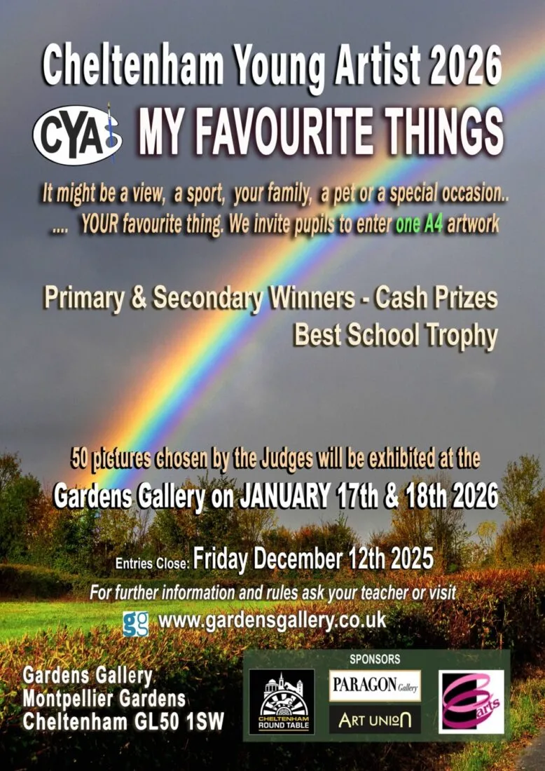 Following the success of our first CYA competition which saw over 600 visitors we are delighted to announce our CHELTENHAM YOUNG ARTIST 2026 to celebrate pupils’ art in the Cheltenham area. Entries are open to both primary and secondary schools. This will culminate in fifty works from Primary and Secondary being framed and displayed in a public exhibition at the Gardens Gallery in Montpellier Gardens, Cheltenham over the weekend of January 17th and 18th, 2026. Exhibited young artists will be invited to an awards ceremony at the gallery on Sunday 17th January at 3pm. Each artist will receive a certificate and awards announced with art prizes for commended and Cash prizes for the top 3 in each section as chosen by the judges. There is also a trophy for the Best School Entry and a public choice.